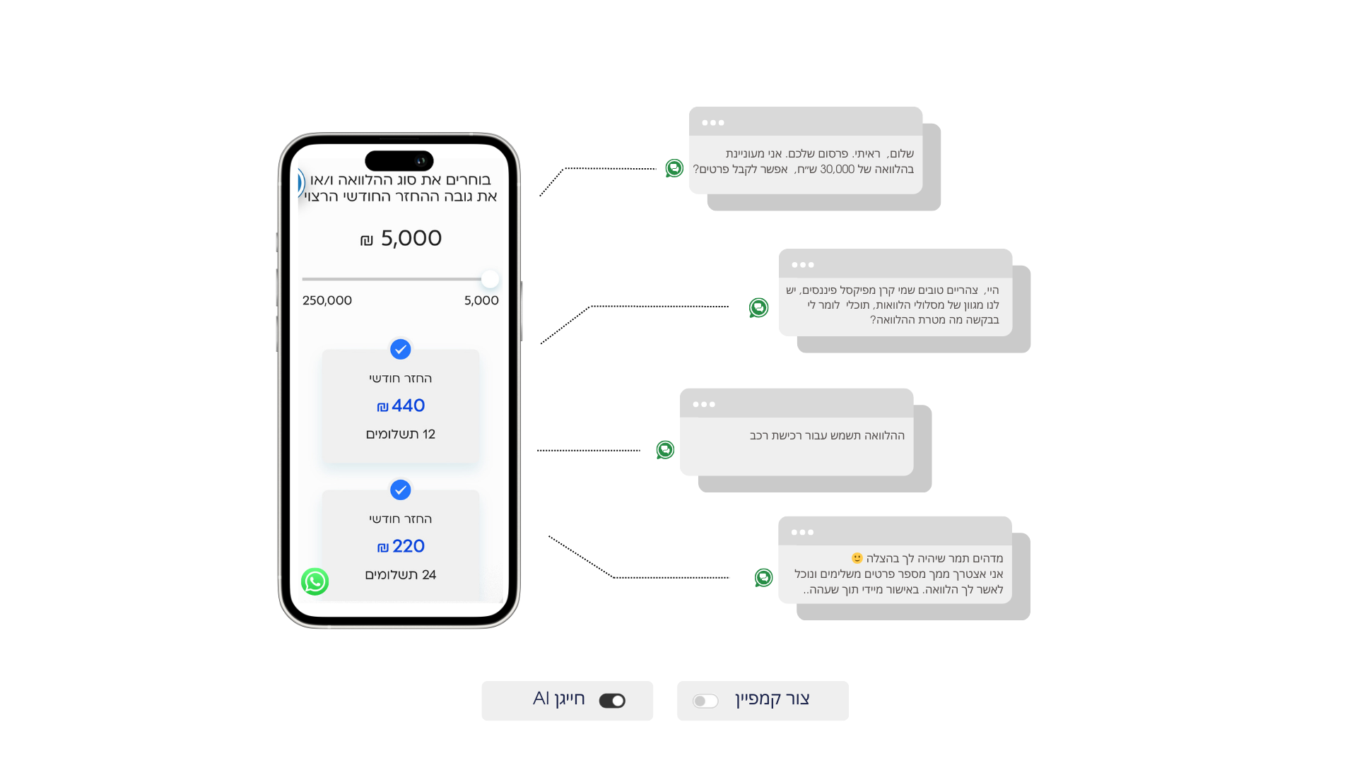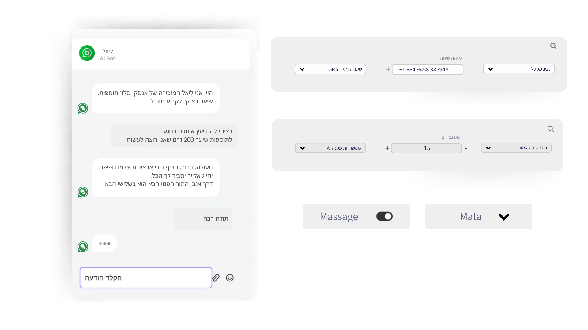 AI בוט קולי אנושי | צאט בוט AI whatsapp | חייגן אוטומטי AI לשיחות יוצאות ונכנסות | אינטרקציות ומסרונים AI | סיוע לנציג בזמן אמת AI