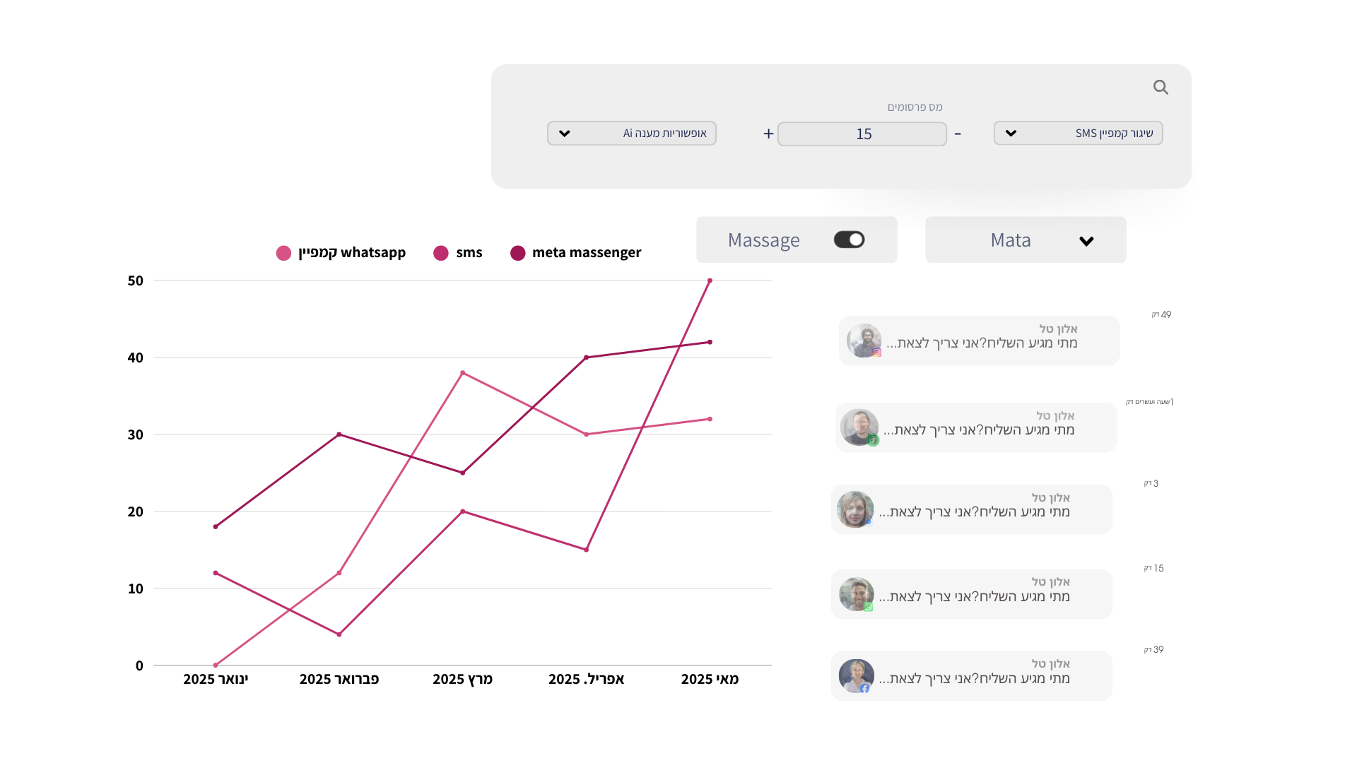 אין צורך לדלג בין מערכות, ממשקים וערוצים שונים. פלטפורמת ההודעות של AI promo מרכזת עבור הצוות שלכם את כל כלי התקשורת הרב־ערוצית במקום אחד, עם חיבור מלא לטלפוניה ולמערכות קיימות